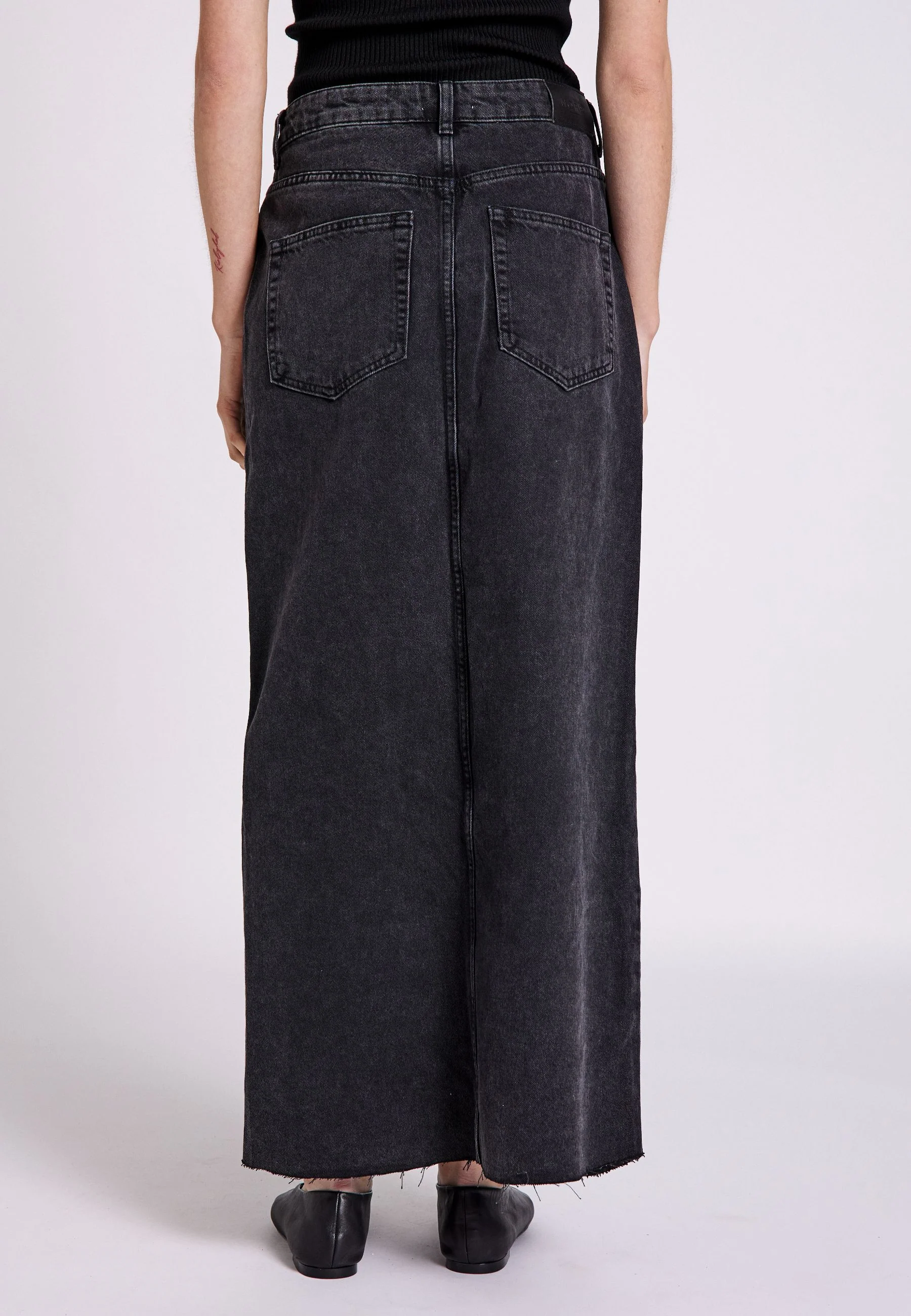 Hannali maxi denim skirt features a high-waist fit and a front slit for ease of movement and a modern touch. The washed finish adds character, making it a versatile piece for casual or dressed-up ensembles.