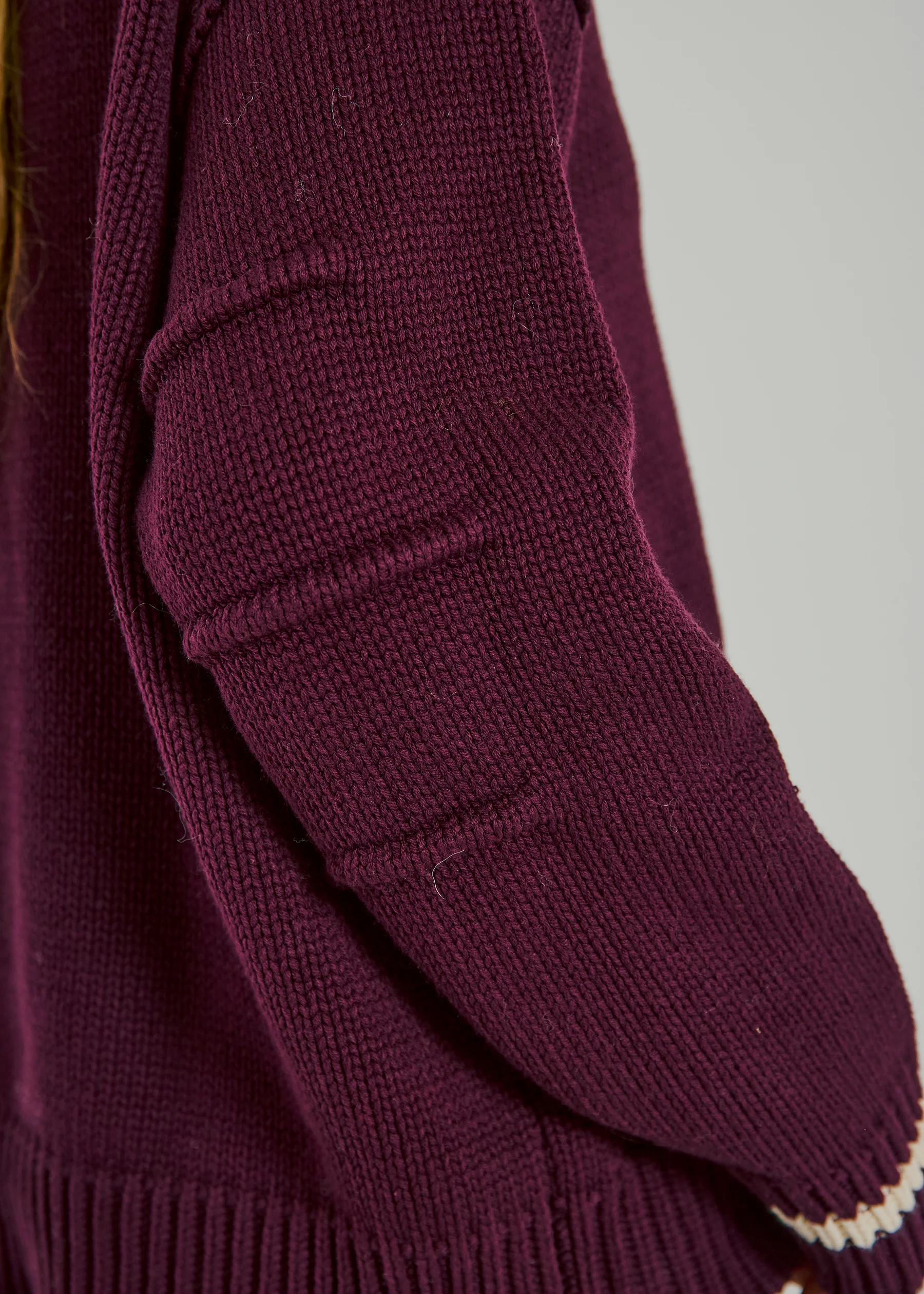 The Margot knit top is a relaxed V-neck sweater featuring delicate contrasting trim along the neckline and cuffs. With its soft knit texture and slightly oversized fit, it offers cozy comfort and an effortless, laid-back aesthetic.