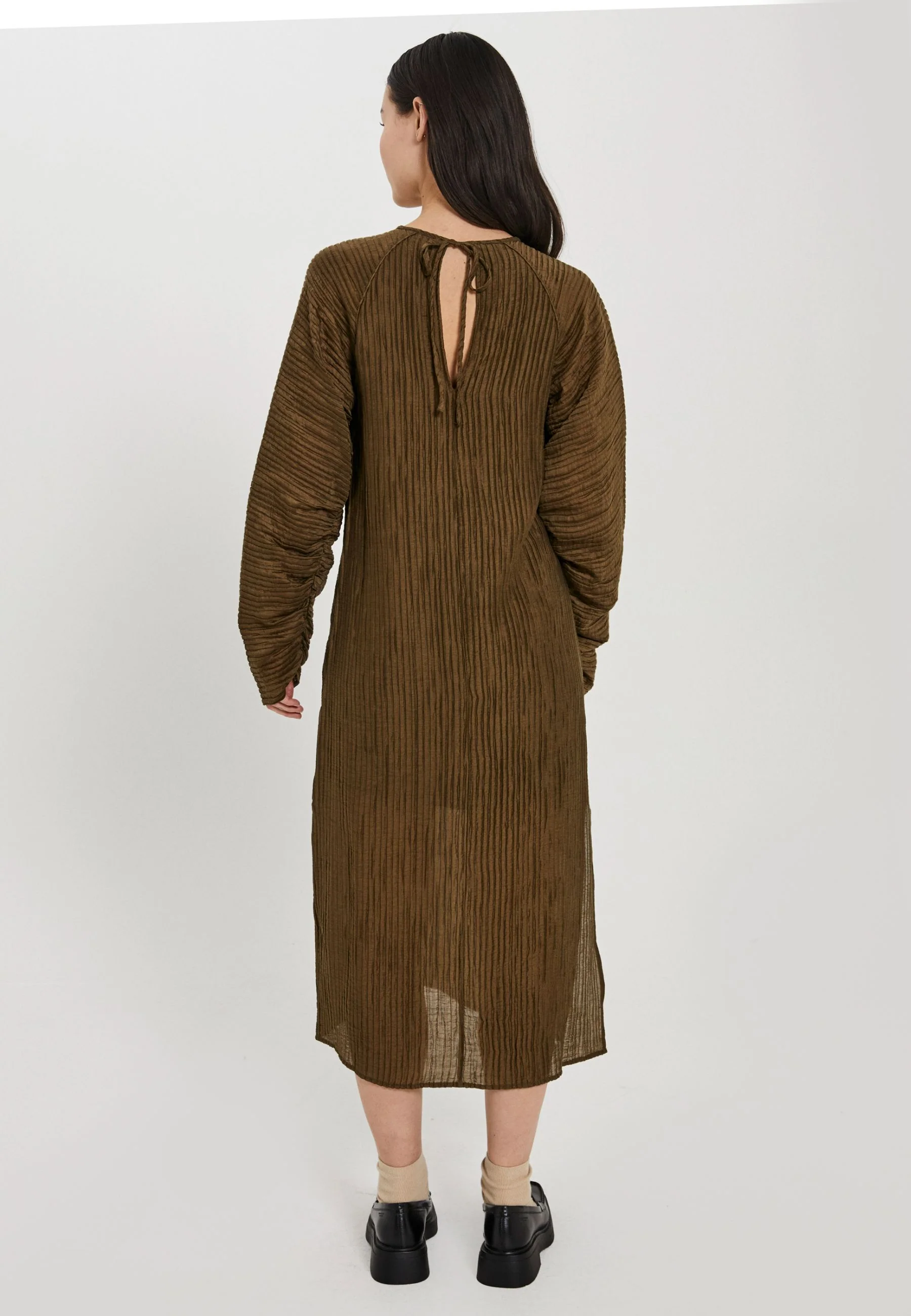 Room dress features a flowing silhouette with a textured, crinkled fabric and long raglan sleeves for a relaxed yet elegant look. Its side slits add ease of movement, making it a versatile choice for both casual and elevated styling